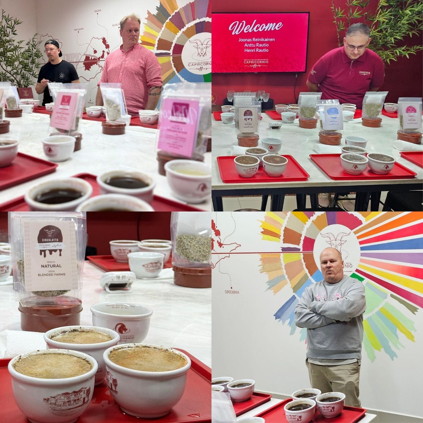 Capricornion maistelutiloissa pääsimme osallistumaan "cuppingiin", jossa testattiin eri papujen makuprofiileja. Joonas, tarkkana ammattilaisena, kävi läpi jokaisen kupin analyyttisesti – hapokkuus, maku ja aromit arvioitiin tarkkaan.
